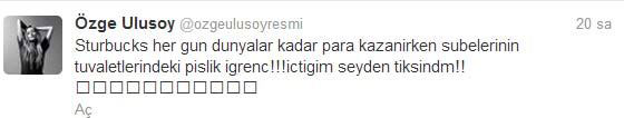 Özge Ulusoy, gittiği bir kahve zincirinin şubesinde yaşadığı rezaleti Twitter üzerinden "Her gün dünyalar kadar para kazanırken şubelerinin tuvaletlerindeki pislik iğrenç! İçtiğim şeyden tiksindim." notuyla takipçileriyle paylaştı.