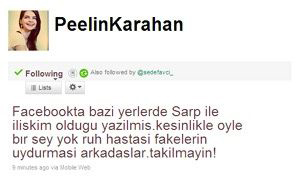 Güzel yıldız bugün twitter sayfasında yazdığı "Facebookta bazı yerlerde Sarp ile ilişkim olduğu yazılmış. Kesinlikle öyle bir şey yok. Ruh hastası fakelerin uydurması arkadaşlar, takılmayın."