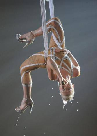 Çıplak vucutla dan eder gibi gözüken bir body ile sahneye çıkan şarkıcı çok profesyonel trapez gösterisi yaptı...