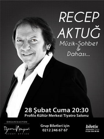 Seslendireceği aşk dolu şarkıların yanı sıra sohbetiyle de izleyenlerine eğlenceli saatler yaşatan Recep Aktuğ tüm sevenlerini 28 Şubat 2014 Cuma günü Saat: 20.30'da Profilo Kültür Merkezi Sahnesine davet ediyor.