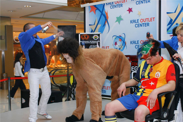Kale Outlet Center'da gerçekleştirilen etkinlikte, saç tasarımı ve stilleri konusunda Türkiye'yi uluslararası alanda temsil eden Türk stilist Rıfat Yılmaz, ezeli rakipler Galatasaray ve Fenerbahçe'yi tek bir vücutta birleştirdi. 25 yaşlarındaki bir modelin yarısını Galatasaraylı bir taraftar, diğer yarısını ise Fenerbahçeli bir taraftar gibi yapan olan Yılmaz'ın canlı performansını katılımcılar hayretler içerisinde izledi.