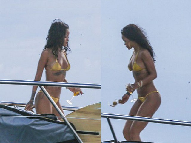 Ünlü şarkıcı Rihanna'nın lüks yatta bikini ile görüntülenen fotoğrafları olay yarattı. Altın rengi küpeleri, bileklikleri ve bikinisi ile beğeni toplayan ünlü şarkıcı teknede de profesyonel fotoğrafçılar eşliğinde elinde şampanya bardağı ile bir kaç kare poz verdi.