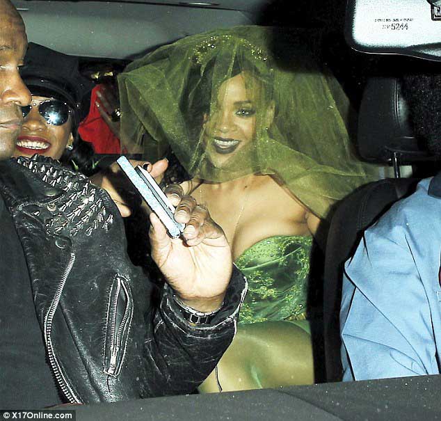 Cadılar Bayramı'nda "Marijuana" kılığına giren Rihanna, partiye "Deniz Kızı Ariel" ve siyah kostümlü 2 kız arkadaşı ile katılan Rihanna'nın saçlarını da uzattığı görülüyor.