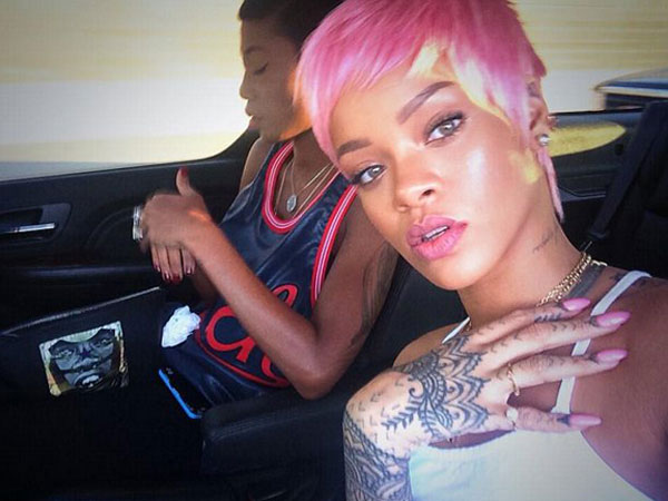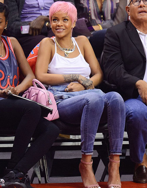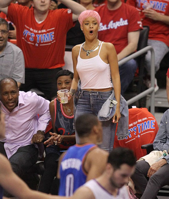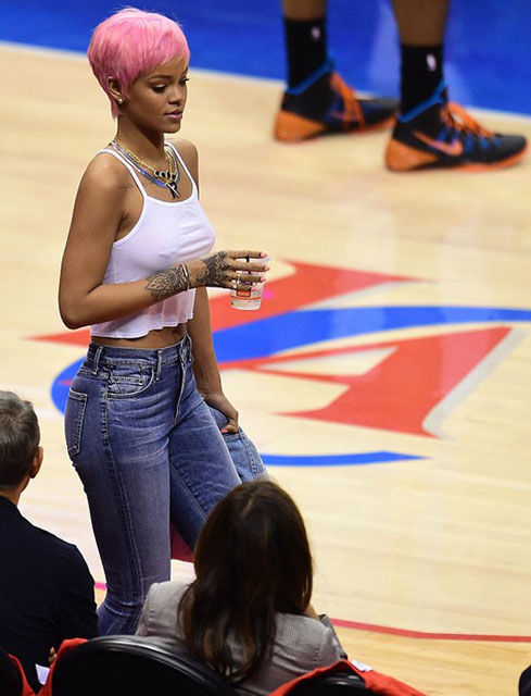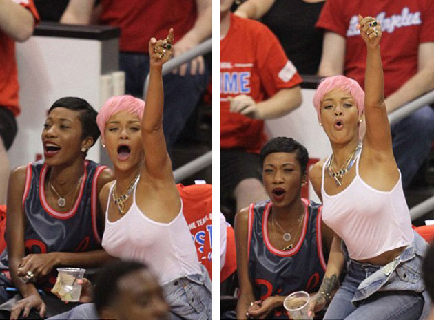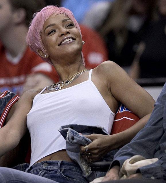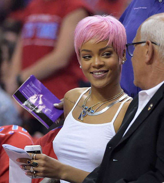 Tam bir basketbol fanı olarak bilinen ünlü şarkıcı Rihanna kısa saçları ve pembe rengi ile yeniden Los Angeles'daki Staples Center'da bulunan stadyumda en ön sırada yerini adı.