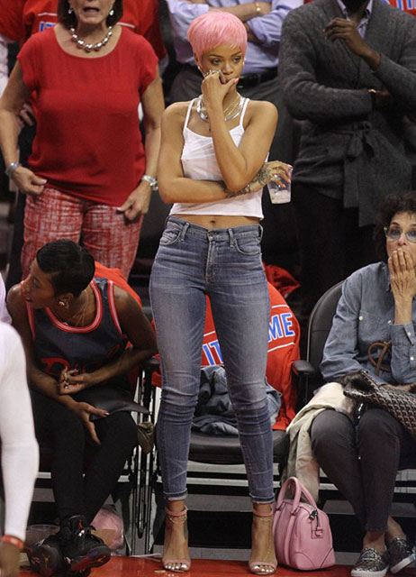 Pembe topuklu ayakkabıları, dar kot pantolonu, beyaz askılı tişörtü ve kot ceketi ile kameralara yansıyan Rihanna her basket maçında olduğu gibi bunda da heyecandan yerinde duramadı.