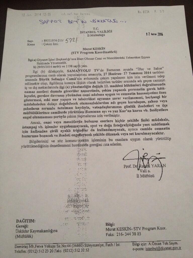 Samanyolu TV yayın ekibinin, Ramazan ayından önce iftar ve sahur programlarını Selimiye Camii'nde çekmek için Diyanet Başkanlığı'ndan alınan yazılı belgeyi zabıtalara göstermesine rağmen zabıtaların bu belgeye aldırış etmedikleri ifade edildi.