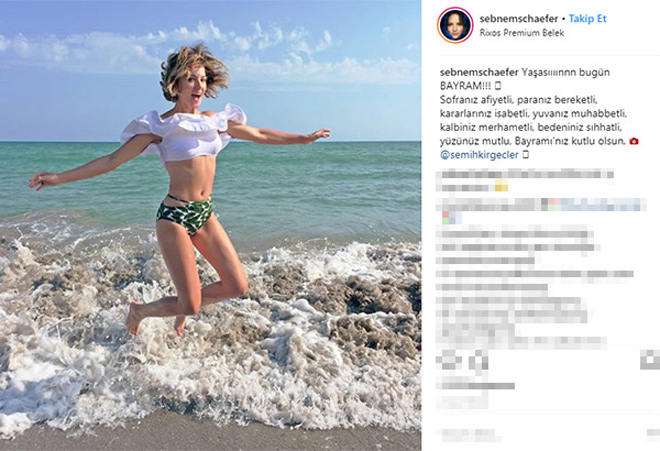 Pek çok ünlü isimden farklı olarak denizde çekilmiş bir fotoğrafını instagram'da paylaşan Schaefer, bu kareye, "Yaşasın bugün bayram. Sofranız afiyetli, paranız bereketli, kararlarınız isabetli, yuvanız muhabbetli, kalbiniz merhametli, bedeniniz sıhhatli, yüzünüz mutlu, Bayramı’nız kutlu olsun" notunu düştü.
