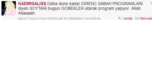 Seda Sayan twitter'ına Aysun Kayacı'yı kastederek şunları yazdı " Daha düne kadar 'iĞRENÇ SABAH PROGRAMLARI' diyen SOYTARI bugün göbekler atarak program yapıyo"