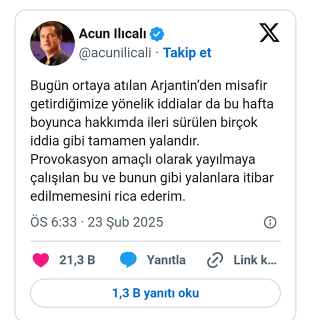 Acun Ilıcalı, yaptığı paylaşımda "Bugün ortaya atılan Arjantin'den misafir getirdiğimize yönelik iddialar da bu hafta boyunca hakkımda ileri sürülen birçok iddia gibi tamamen yalandır.