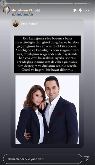 Boşanma hakkında bir açıklama yapmayı tercih etmeyen Demet Şener ise Cenk Küpeli'nin paylaşımını hesabında yayınlayarak şükür emojisi koydu.
