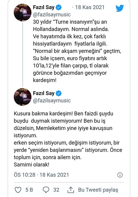 Aylardır önü alınamayan TL'deki değer kaybına Twitter'dan tepki gösteren piyanist Fazıl Say, "30 yıldır 'turne insanıyım' şu an Hollanda'dayım.