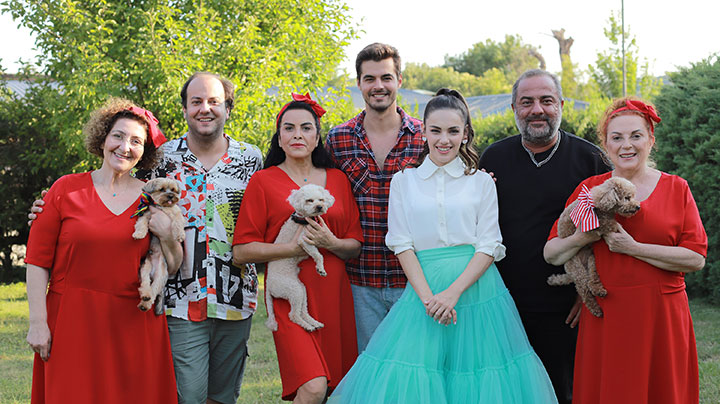 “Sette bize Altın Kızlar diyorlar” diyen usta oyuncular, köpeklerini de kucaklarına alarak filmin genç oyuncuları ve yönetmeniyle eğlenceli fotoğraflar çektirdiler.