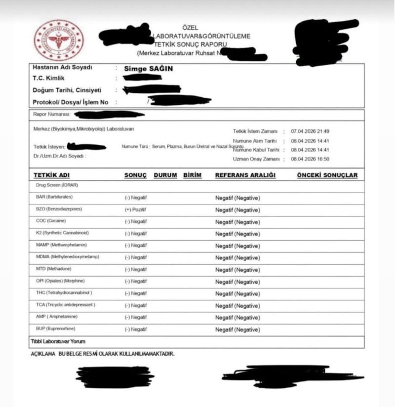 Yasaklı madde soruşturması kapsamında gözaltına alınıp yurt dışına çıkış yasağı ile serbest bırakılan Simge Sağın, özel bir laboratuvarda yaptırdığı uyuşturucu testi sonuçlarını paylaştı.