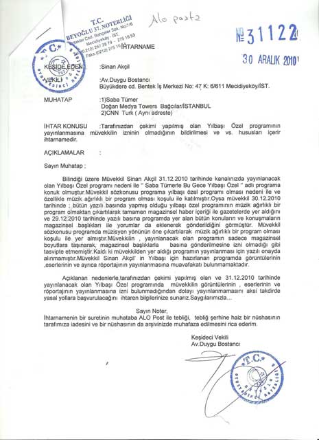 Şimdiye kadar, özel hayatımın da basına taşmasına rağmen, ne biten ilişkimin ardından ne de isim vererek kimseyle ilgili demeç vermemeye büyük özen gösterdim..Müzik arasındaki konuşmaların, bana sorulan sorulara verdigim cevapların sanki tüm program boyunca böyle konusulmuş gibi basına verilmesine olağanüstü üzüldüm. Bu sadece bana degil, benimle birlikte programa katılan birbirinden değerli sanatçı dostlarıma da yapılan bir haksızlıktır. Böyle bir durumda özel hayat kullanılarak, programın reklamının yapılmasının 'etik' olmadığını düşünerek, Sayın Saba Tümer'e yarınki programın yayınlanmaması için ihtarname gönderdim. Sonuç olarak avukatım yapılan bu haksızlık karşısında programın kanalda yayınlanmaması için hukuki girişimlerde bulunmuştur..