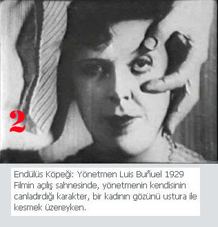 2. Endülüs Köpeği: Yönetmen: Luis Bunuel 1929 Filmin açılış sahnesinde, yönetmenin kendisinin canlandırdığı karakter, bir kadının gözünü ustura ile kesmek üzereyken.