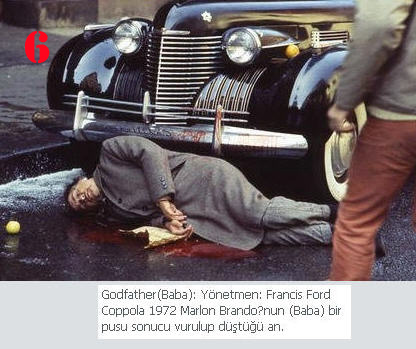 6. Godfather(Baba): Yönetmen: Francis Ford Coppola 1972 Marlon Brando'nun (Baba) bir pusu sonucu vurulup düştüğü an.