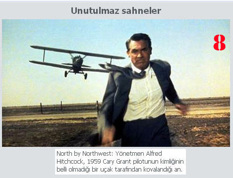 8. North by Northwest: Yönetmen: Alfred Hitchcock,1959 Cary Grant pilotunun kimliğinin belli olmadığı bir uçak tarafından kovalandığı an.