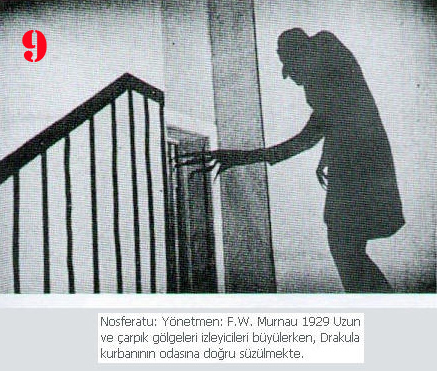 9. Nosferatu: Yönetmen: F.W. Murnau 1929 Uzun ve çarpık gölgeleri izleyiciyi büyülerken , Drakula ve kurbanın odasına doğru süzülmekte.