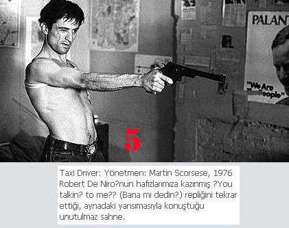 5. Taxi Driver: Yönetmen: Martin Scorsese,1976 Robert De Niro'nun hafızalarımıza kazınmış You talkin to me?( Bana mı dedin?) repliğini tekrar ettiği , aynadaki yansımasıyla konuştuğu unutulmaz sahne.