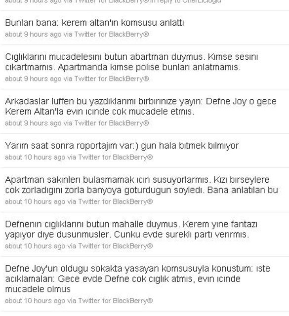 Arkadaslar lütfen bu yazdıklarımı birbirinize yayın. Defne Joy o gece Kerem Altan'la evin içinde cok mücadele etmiş. Çığlıklarını mücadelesini bütün apartman duymuş. Kimse sesini çıkartmamış. Apartmanda kimse polise bunları anlatmamış. Bunları bana, Kerem Altan'ın komşusu anlattı.