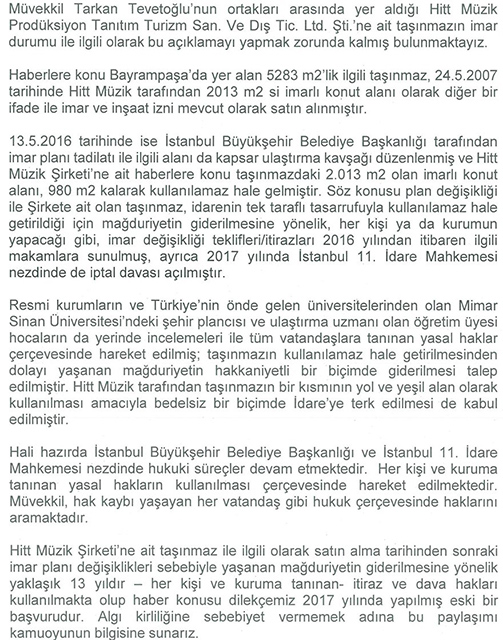 Söz konusu arsa ile ilgili kimseden bir rant beklentisi ya da ayrıcalık isteğinin olmadığını vurgulayan Tarkan şu ifadeleri kullandı;