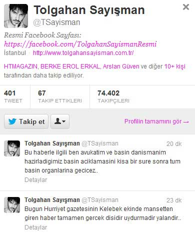 Bu haberi yapan Hürriyet Gazetesi'nin Kelebek ekinden haberin doğru olmadığını belirten bir özür yazısı yayımlamasını bekliyorum. Eğer bu gerçekleşmez ise son çare olarak avukatlarım aracılığıyla yasal yollara başvuracağımı siz sevgili basın mensubu arkadaşlarıma ve kamuoyuna duyuruyorum.