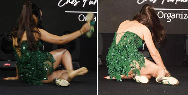 Zümrüt yeşili bir elbise ile podyuma çıkan Altıntop, talihsiz bir kaza yaşadı.
