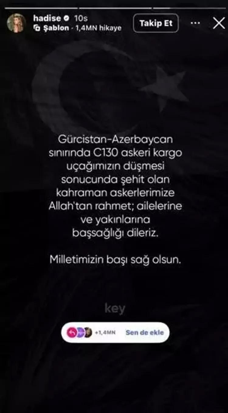 Azerbaycan'dan kalkan Türk Silahlı Kuvvetleri'ne ait kargo uçağı Gürcistan'da düştü. Milli Savunma Bakanlığı düşen uçakta 20 askerin şehit olduğunu açıkladı. Ünlü isimler, kahreden haber sonrası taziye mesajları yazdı.