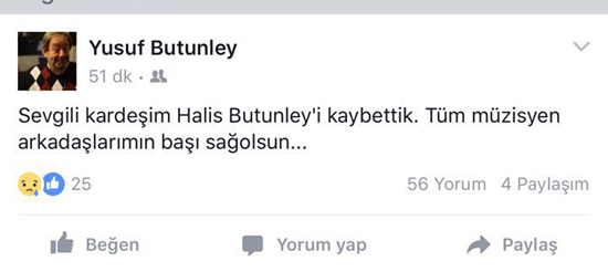 Halis Bütünley'in vefatını kendisi gibi duayen müzisyenlerden Yusuf Bütünley sosyal medyada duyurdu...