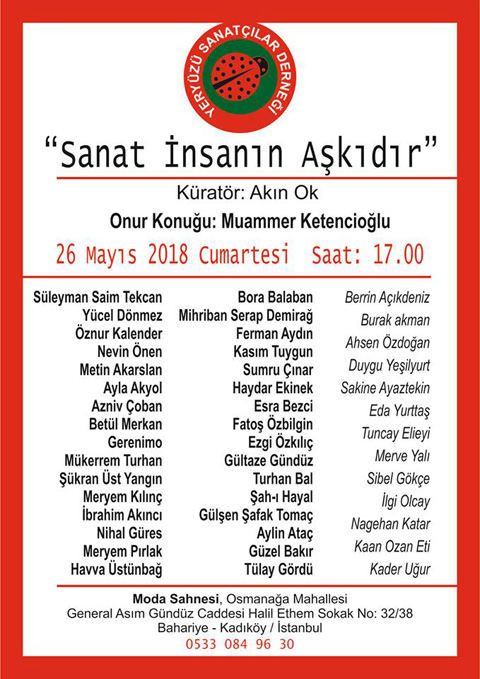 ‘Sanat İnsanın Aşkıdır’ sloganıyla başlayacak olan ilk etkinlik 26 Mayıs Cumartesi günü.. Süleyman Saim Tekcan, Yücel Dönmez, Öznur Kalender ve Nevin Önen, Mükerrem Turhan, Meryem Pırlak, Haydar Ekinek, Mihriban Serap Demirağ, Kasım Tuygun, Şebnem Hacıalihafız, Şükran Üst Yangın, Aylin Ataç, Ayla Akyol, Azniv Çoban, Sumru Çınar, Metin Akarsaln, Esra Bezci, Geronimo, Şah-ı Hayal, Erkan Özbey, Fatoş Özbilgin, Betül Merkan, Öznur Kalender ve Nihal Güres gibi usta ressamlar başta olmak üzere onlarca ressamın eserleriyle bir sergide buluşacağı etkinliğin dinleti bölümünde ise büyük usta Muammer Ketencioğlu var.