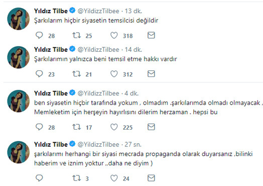 " Şarkılarımın yalnızca beni temsil etme hakkı vardır. Şarkılarım hiçbir siyasetin temsilcisi değildir. Ben siyasetin hiçbir tarafında yokum, olmadım, şarkılarımda olmadı olmayacak. Memleketim için herşeyin hayırlısını dilerim her zaman hepsi bu"