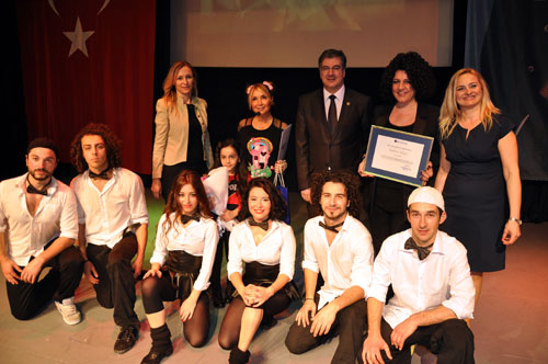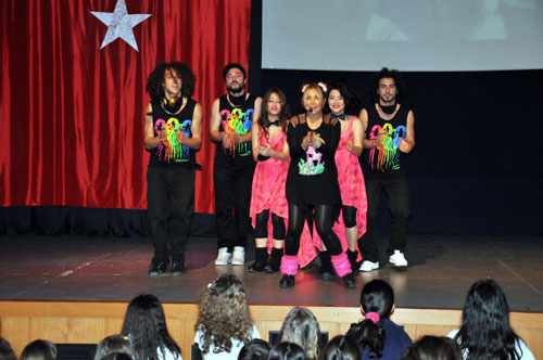 Okulun Müdürü Ergun Karahasanoğlu dans eden öğretmenleri kutlarken Yonca Evcimik ve katkılarından dolayı Banu Noyan?a teşekkür plaketi taktim etti?