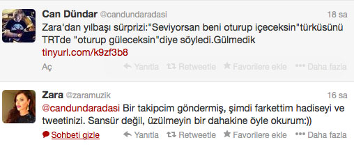 İlk anda olay TRT sansürü diye kamuoyuna yansıdı. Ancak Can Dündar haberimizi Zara'ya yollayıp tweetter üzerinden sorunca işin aslı ortaya çıktı. TRT sansürü değil Zara'nın işgüzarlığıymış. Ünlü sanatçı bunu da şu satırlarla itiraf etti;