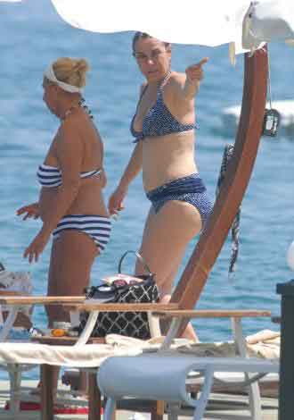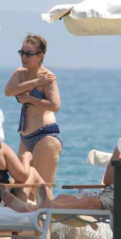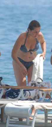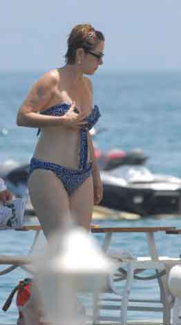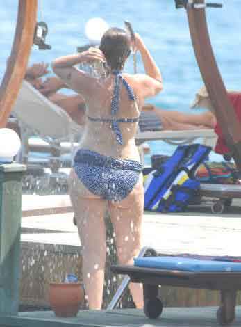 Ancak muhabirleri fark edince tadı kaçtı. Bikinili görüntülenmek istemeyen sanatçı, önce havlusuna sarındı, sonra da garsonlara muhabirleri uzaklaştırmaları için talimat verdi.